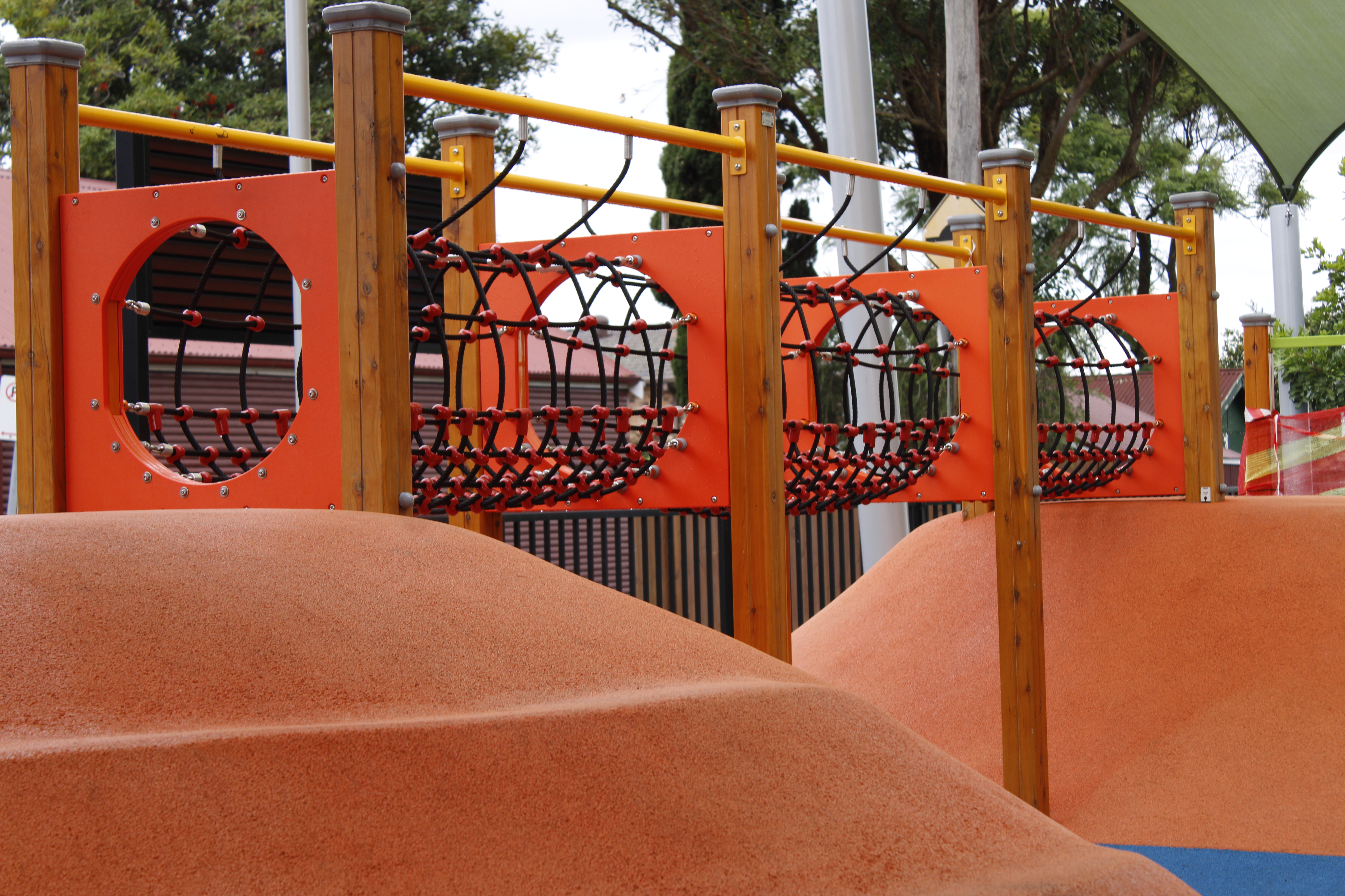 When I think about Kempt field one word comes to mind, BIG! The playground includes many features including an impressive 6metre adventure rope bridge and climbing structure that will attract all the spider man fans as they climb and weave their way to the top just a like a spider to reach the massive rainbow super slide! An impressive 4.5 metre mammoth rope nest swing is another big feature aswell as the double flying fox complete with a harnessed seat for younger thrill seekers! A toddler play area has also been incorporated into the design allowing younger ones to safely be included in the fun, large rubber mounds also allow children to work on their climbing skills and practice their risk analysis all while enjoying the view over the park from the top, there are trampolines to jump the energy out. A Bike track also weaves it way throughout the playground with mini road signage exposing children to road safety rules while allowing bike and scooter access. As expected there are slides and swings for the younger ones and also a fantastic mum and bub swing which is extremely thoughtful of the design. The park is shaded by sails and also the natural landscape. A moduplay play area is comflaugued into the tree scape that allows children to practice balance and risk taking while paying respect to the natural landscape surrounding it.