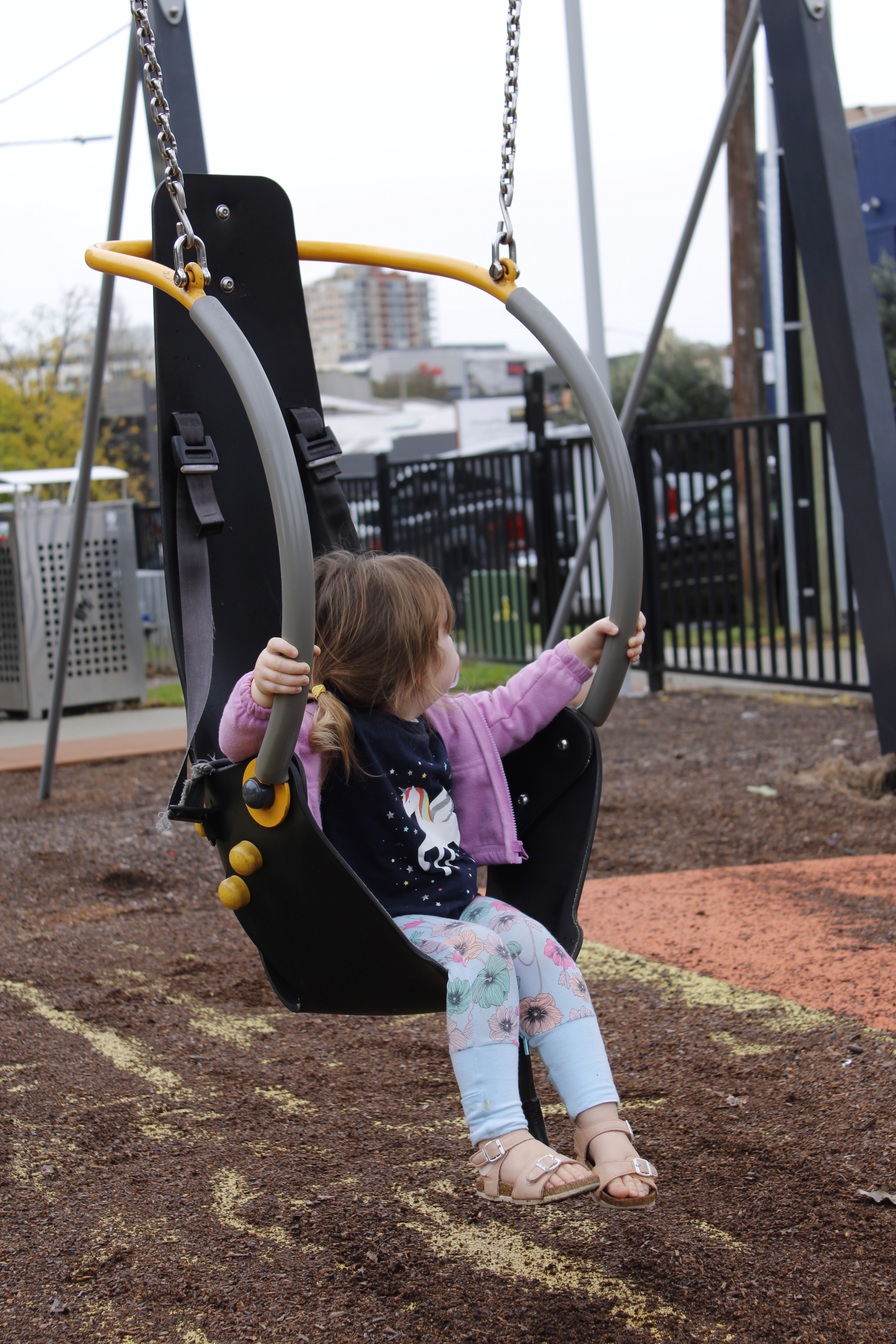 Bench seating and picnic tables aswell as the rubber ground also makes this park inclusive of crawling babies. There are areas where wood chips cover the ground like under the flying fox and climbing net but there is ample space to enjoy with younger children. The park is partially fenced along Durham Ave and Roberts lane but open to the sporting fields.