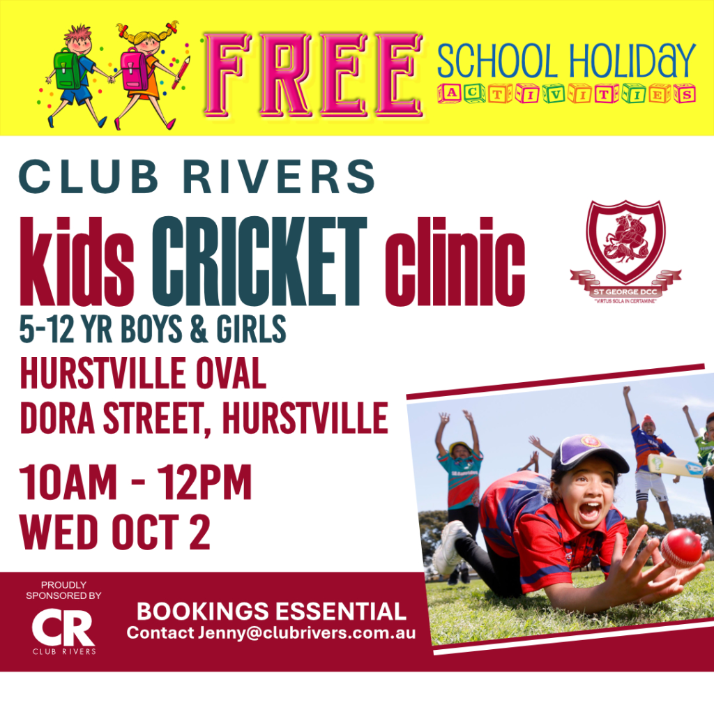 Looking for another FREE, fun and active way to keep the kids engaged during the school holidays? Club Rivers are hosting a **Free Cricket and Little athletics Clinics**! Perfect for beginners and budding cricketers and athletes alike, these clinics offers hands-on coaching, exciting drills, and friendly games. It’s a fantastic opportunity to develop new skills, stay active, and make new friends—all while learning the sport of cricket and athletics! Suitable for kids 5 – 12years, this free workshop is the perfect way to spend the holidays. Don’t miss out— bookings are essential so register now! Email – Jenny@clubrivers.com.au