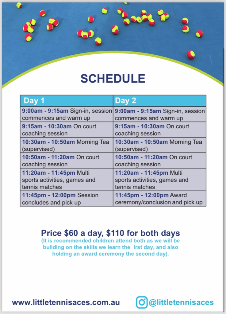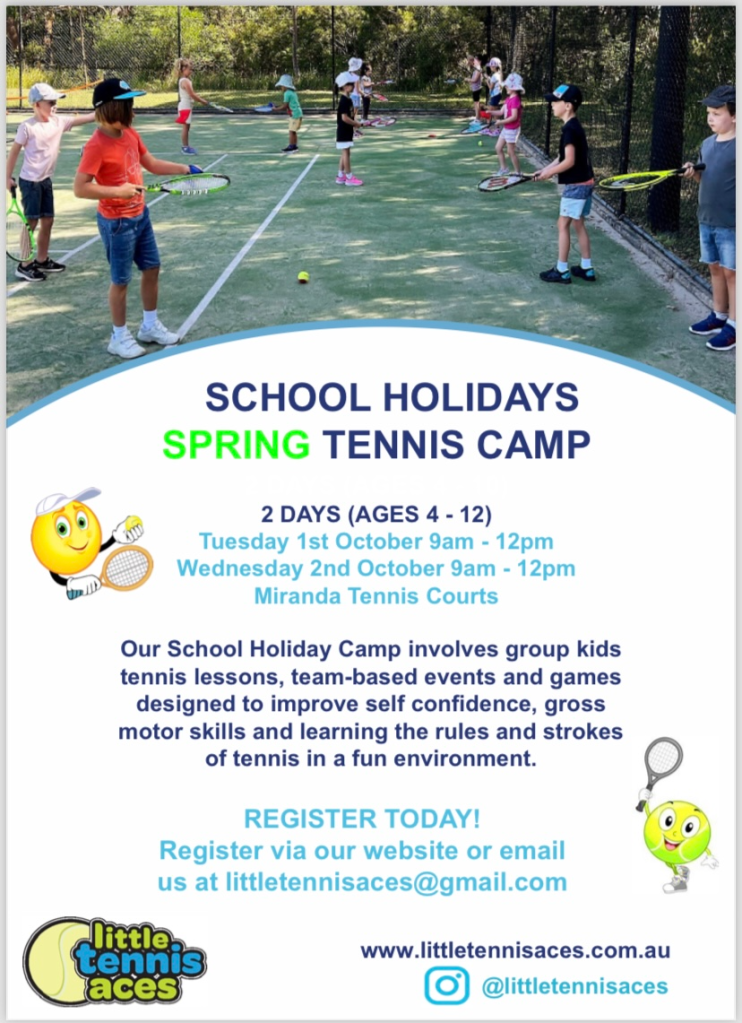 Calling our next generation of Wimbledon stars looking to stay active over the school holidays!! Little Tennis Aces is running a super-charged tennis camp for kids aged 4-12 at the Miranda Tennis Courts on Tuesday 1st October and Wednesday the 2nd October from 9am-12pm.